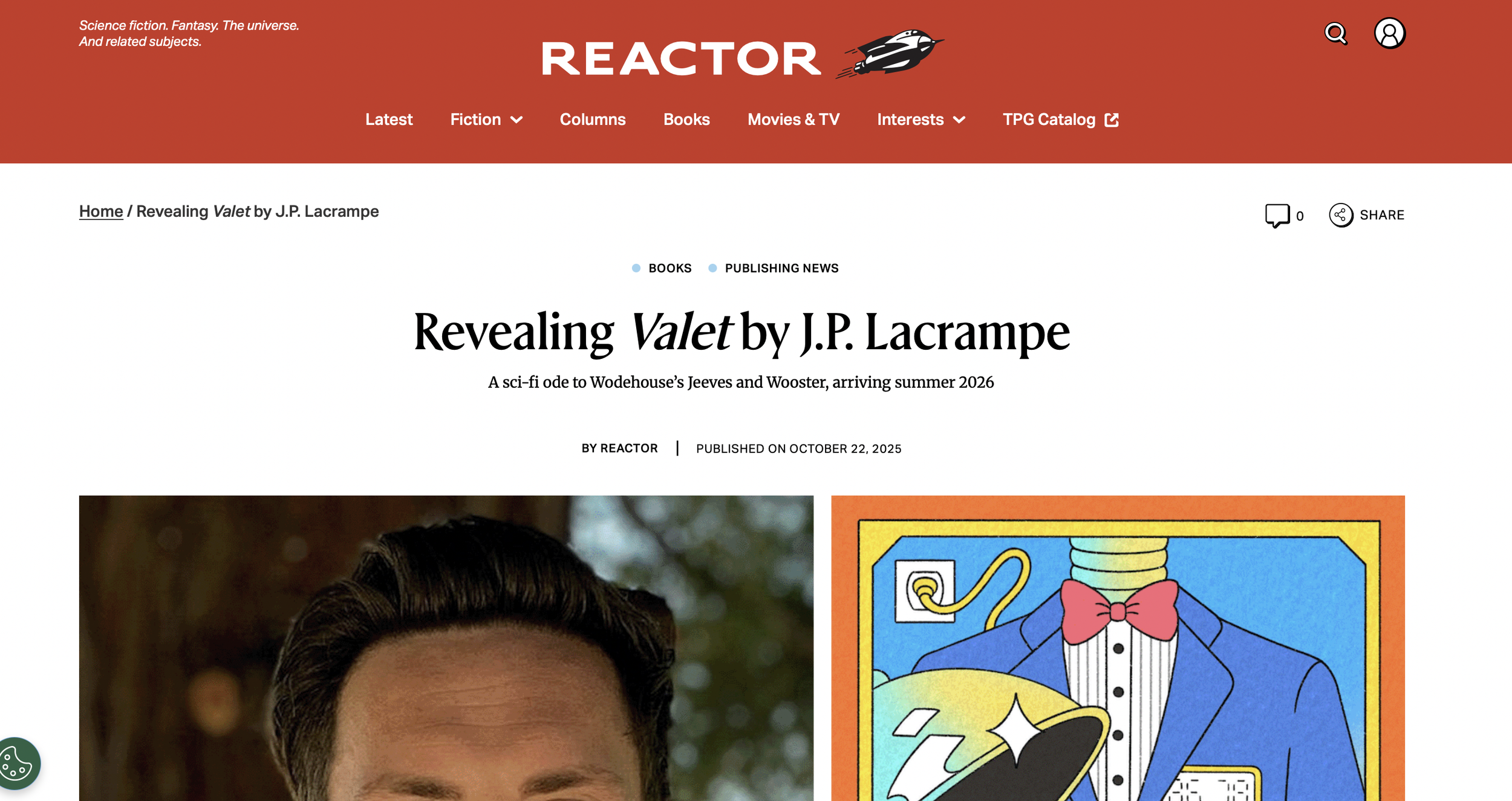 “Valet is a hilarious and bracing examination of the near future, where Cy, a techbot servant, must navigate the complexities of humans to maintain his utility score. What makes this such a winning and openhearted novel is that J.P. Lacrampe goes beyond the initial premise by looking at the universal anxiety of family, of being tied to people with whom you will rise and fall, either toward a new update or into obsolescence."